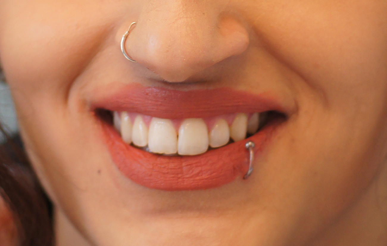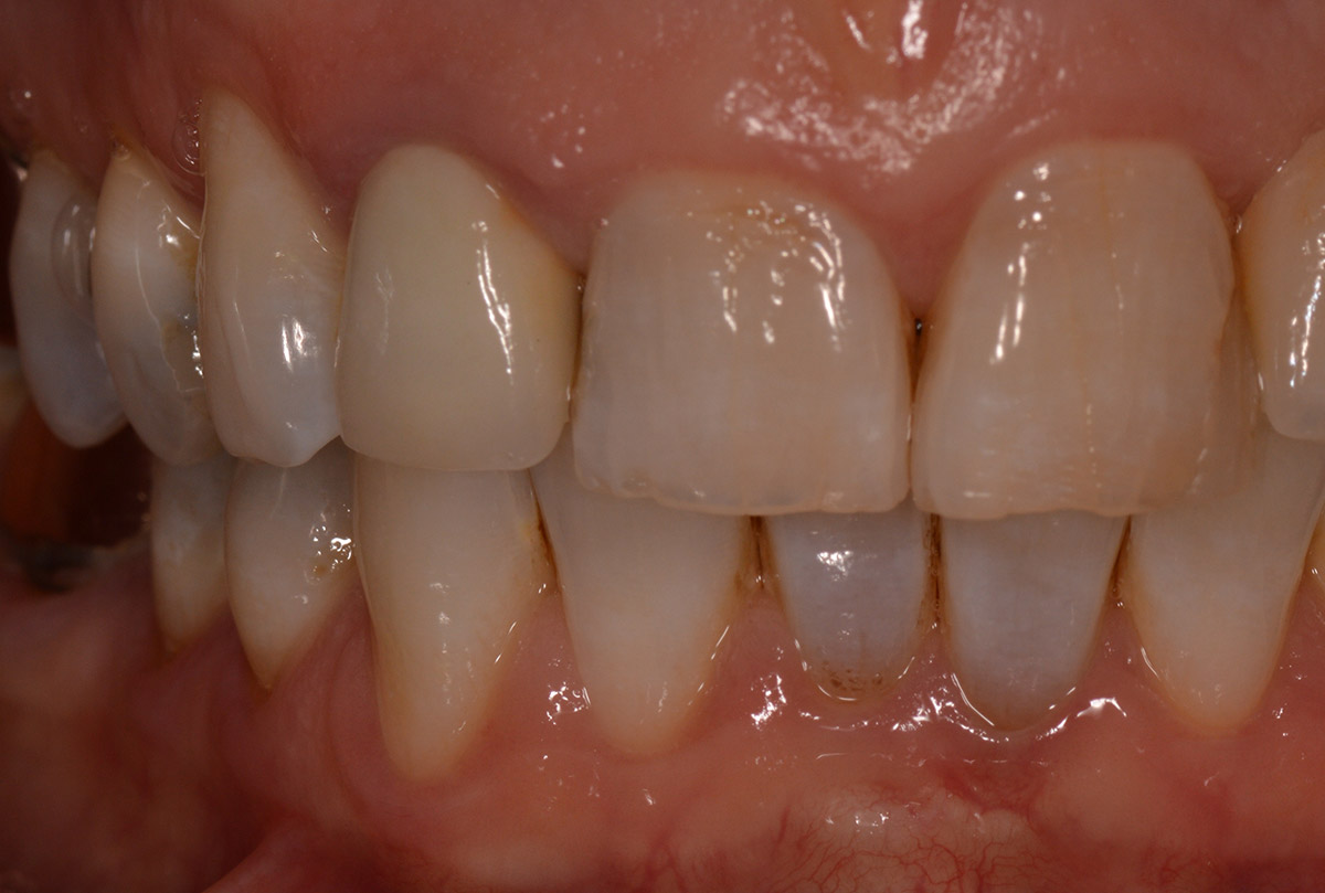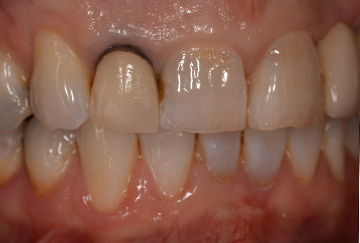 Porcelain Veneer used to mask an discoloured tooth and bring forward to match the adjacent teeth.