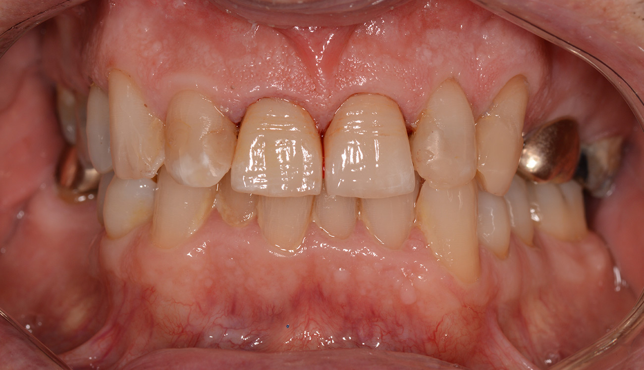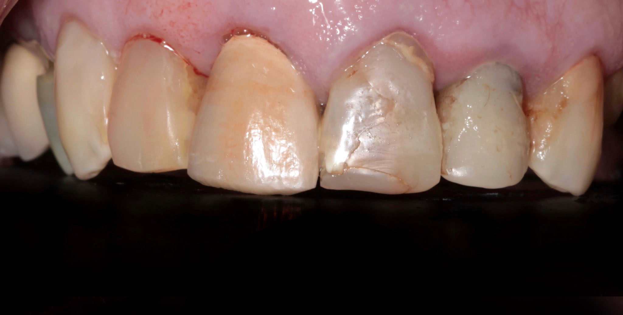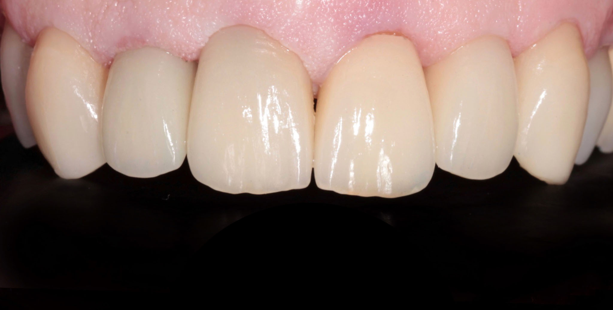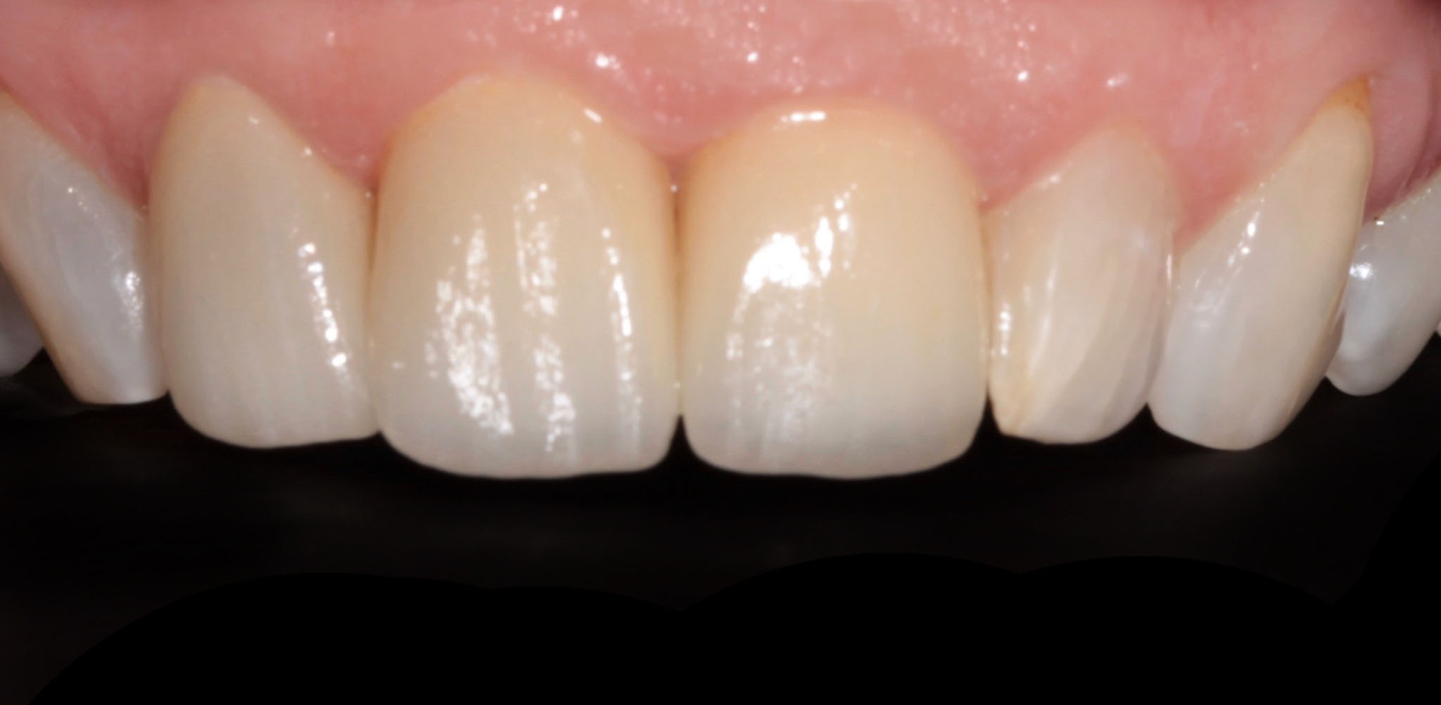 2 Emax crowns fitted to patients front teeth to disguise cracks and discolouration. Great care is taken during shade and shape selection to ensure a perfect match.